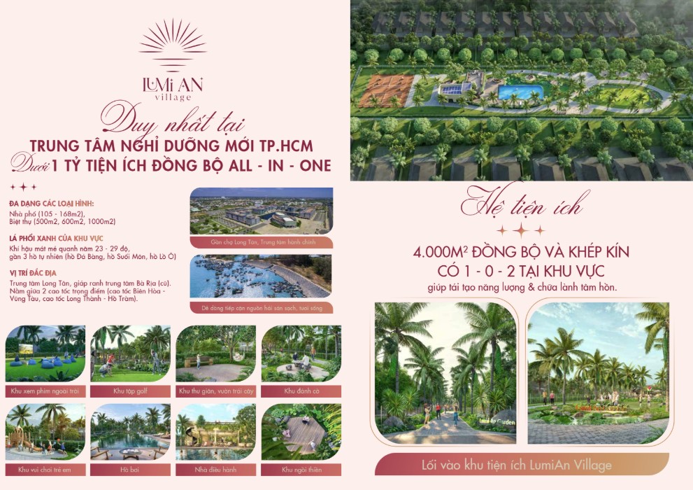 Tiện ích nội khu hơn 4.000m² gồm hồ bơi, sân thể thao, khu tập golf mini, clubhouse, hồ sen, vườn thiền và rạp phim ngoài trời – mang lại trải nghiệm nghỉ dưỡng giữa thiên nhiên.