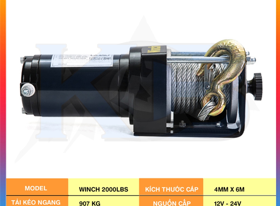 - Tời ắc quy-Tời cứu hộ ô tô 2000Lbs (900kg): có động cơ có công suất 2.7hp, điện áp 24V, có khả năng kéo tải trọng lên đến 900Kg, giúp di chuyển xe hay các hàng hóa nặng một cách dễ dàng, thuận tiện. Tời điện kéo xe 2000LBS (24V) có thể kéo trong những địa hình phức tạp, khó khăn như trên con đường quanh co, bị phủ tuyết dày hay bị vùi sâu trong bùn lầy.