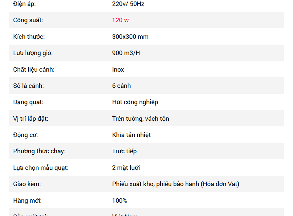 ✔ Công suất 120W – Lưu lượng 900m³/h