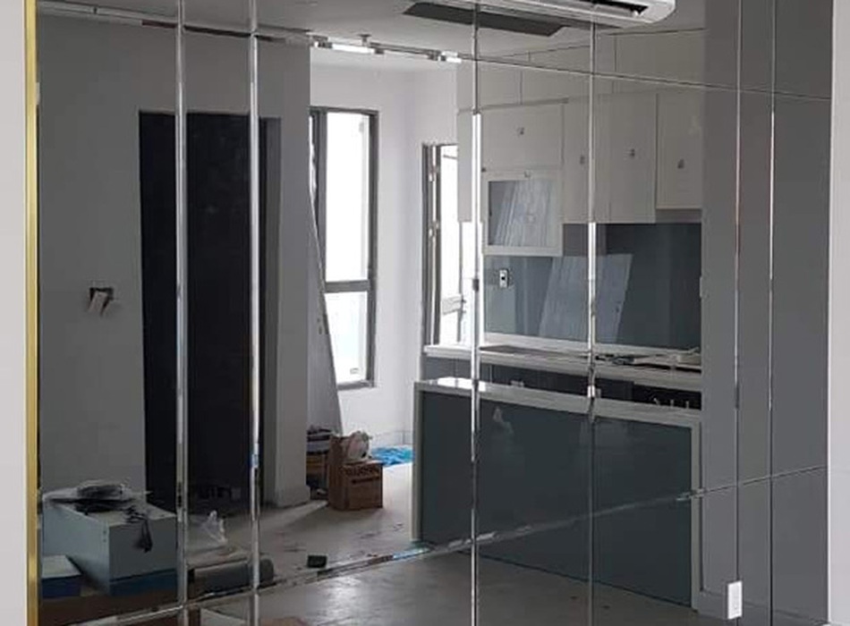 Lắp đặt kính thủy màu xám khói trang trí phòng khách