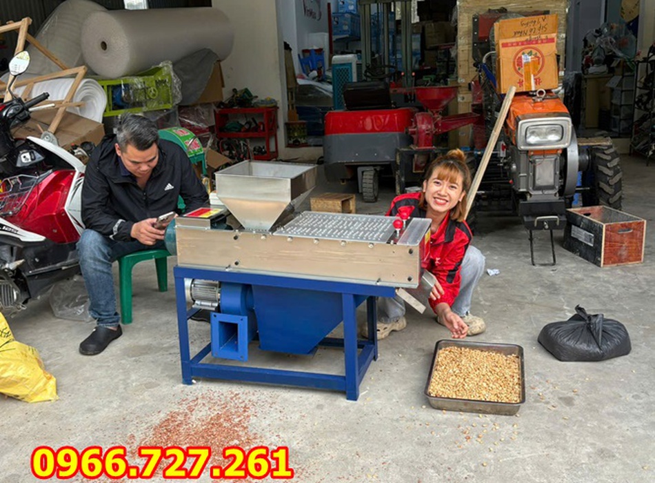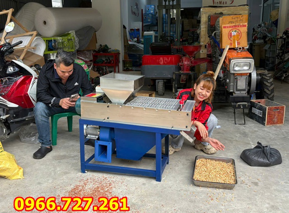 Máy bóc vỏ lụa đậu phộng gồm 2 bàn chà được làm nhám, các bàn chà này sẽ chà để bóc vỏ lụa ra khỏi đậu phộng, phía dưới được gắn thêm 1 quạt thổi để thổi phần vỏ lụa đã được tách ra ngoài. Với năng suất cao, tỷ lệ sạch của máy đến 90% trong thời gian ngắn.