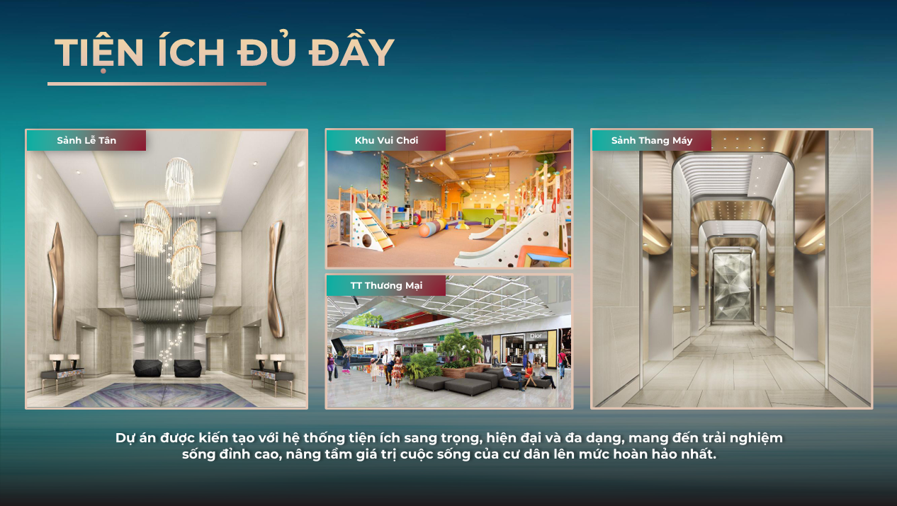 + Tiện ích chuẩn 5 sao: Hồ bơi vô cực, sky bar, gym, spa, lounge, trung tâm thương mại ngay khối đế.