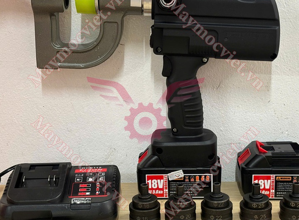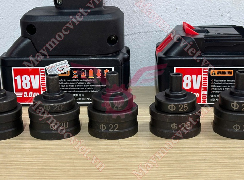 - Phụ kiện: 2 pin dung lượng cao (3.0Ah), 1 sạc pin nhanh, 1 mũi đột theo kích thước tùy chọn (16,20,22,25,32mm).