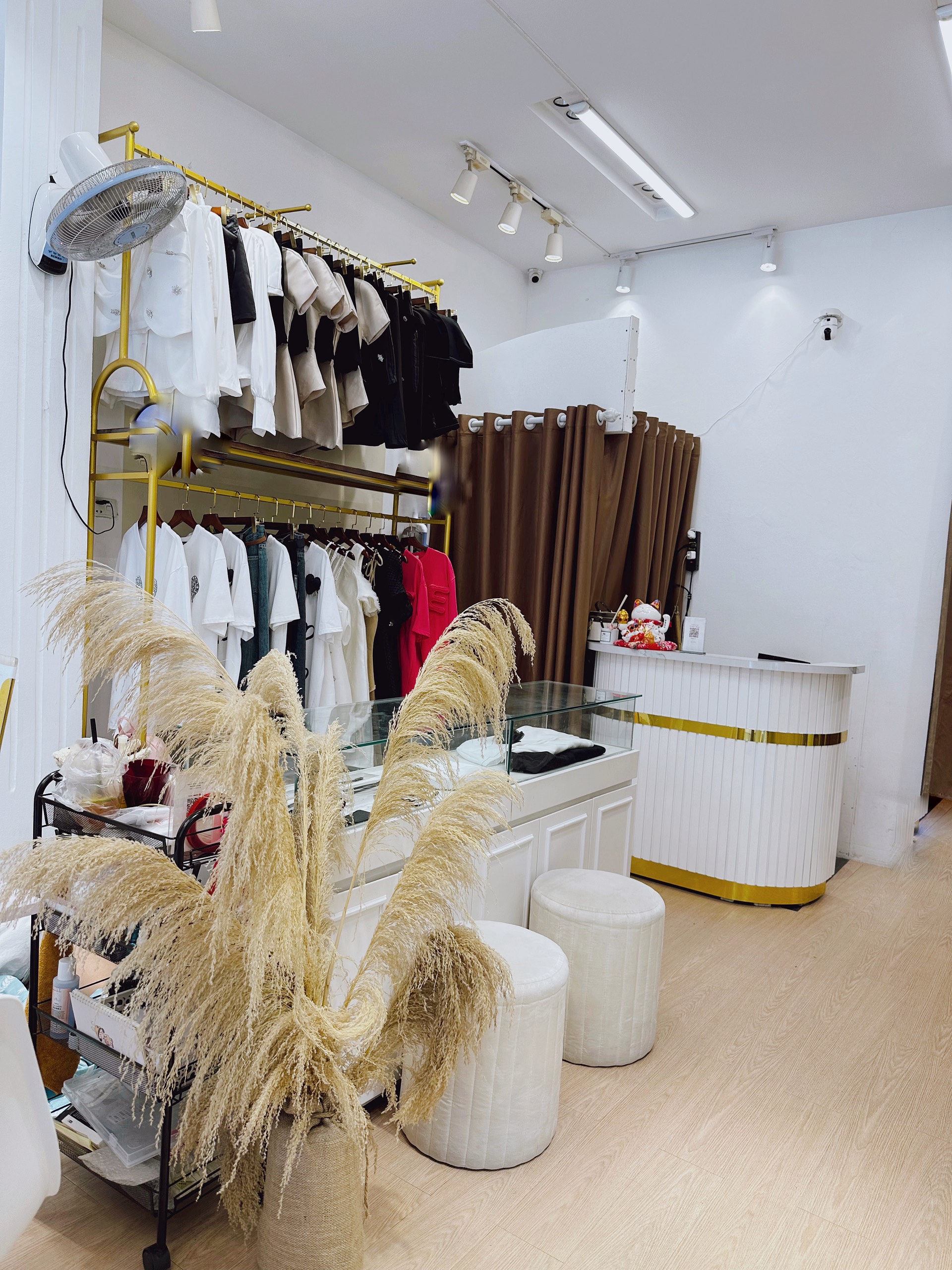 Toàn bộ nội thất - thiết kế - thiết bị kinh doanh thời trang : ( Bao gồm : cửa kính, điều hoà, kệ khung treo, 200 móc quần áo, 3 camera của FPT, wifi còn 2 tháng đã thanh toán tiền, tủ kính để đồ, kệ thu ngân, gương gợn sóng bọc nhung, 2 manocanh, hệ thống đèn, biển treo…) Mặt sàn giả gỗ mới tinh.