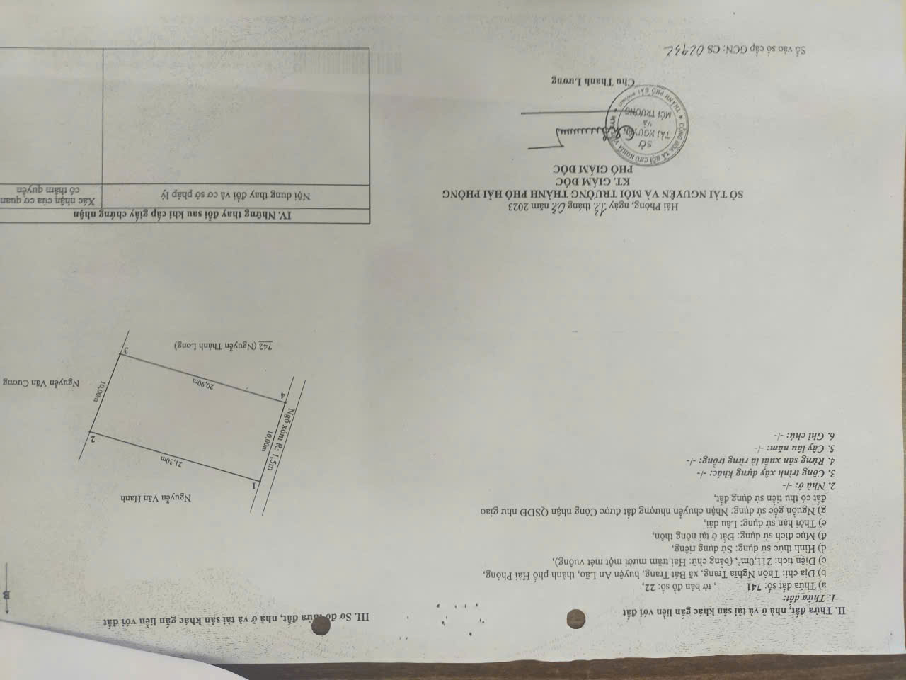 Bán lô đất 216m2 full thổ cư tại thôn nghĩa xã bát trang an lão hải phòng.