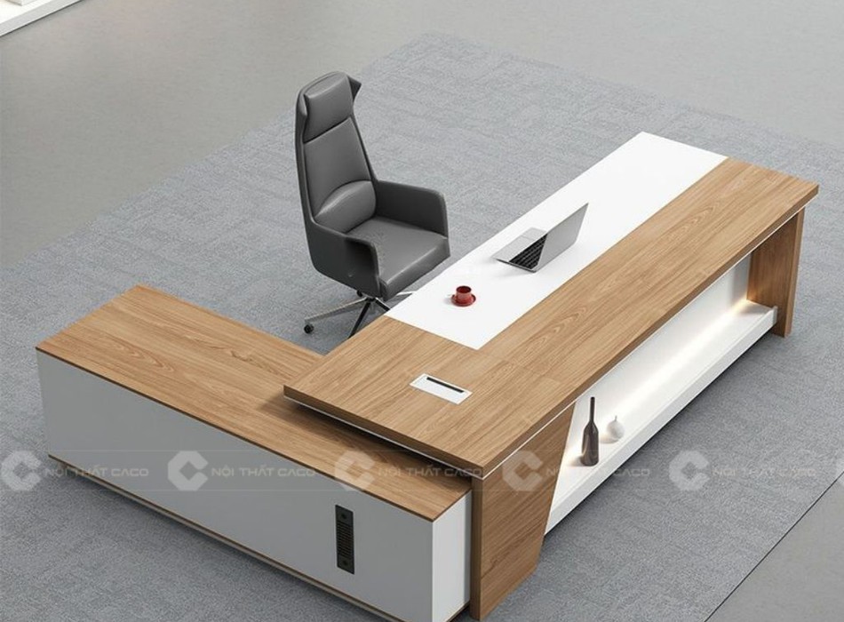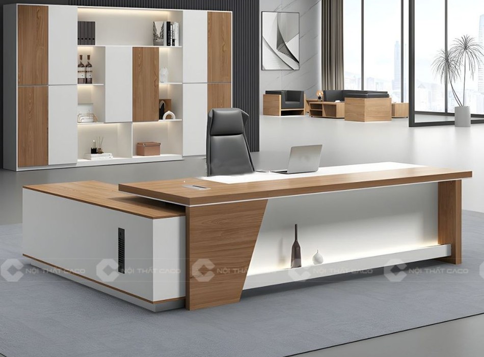 Thiết kế hiện đại, khẳng định vị thế với mẫu bàn giám đốc chữ L gỗ công nghiệp. Tông màu gỗ sáng tự nhiên ấm áp và sắc trắng thanh lịch. Đường nét vuông vức, dứt khoát không chỉ tạo diện mạo sang trọng mà còn giúp khẳng định gu thẩm mỹ hiện đại.