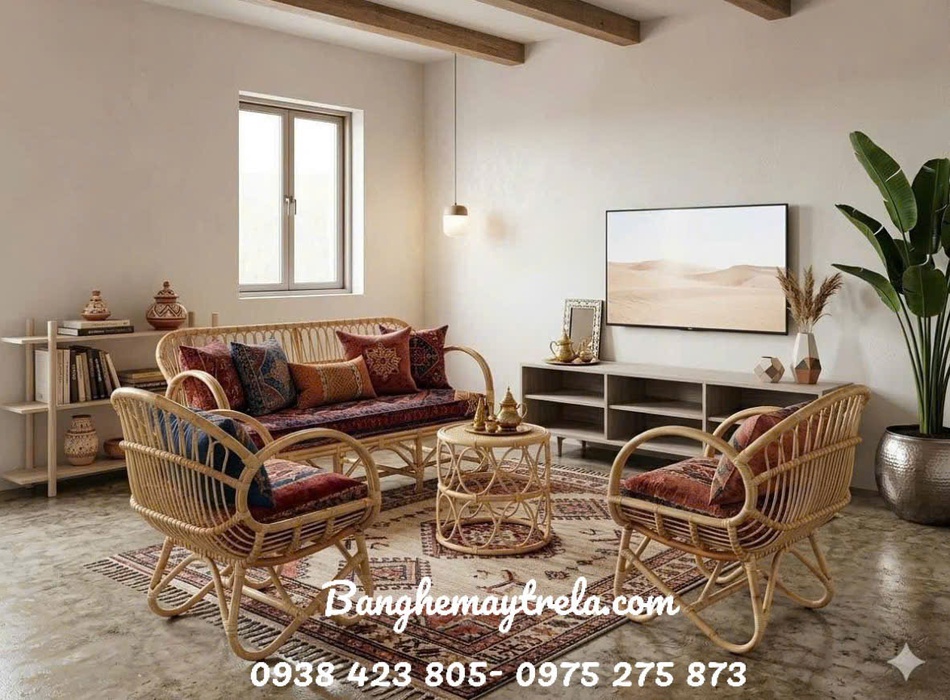 Sofa mây tay cuộn là lựa chọn lý tưởng cho những ai yêu thích phong cách nội thất gần gũi thiên nhiên nhưng vẫn tinh tế, hiện đại. Sản phẩm được làm từ mây tự nhiên hoặc mây nhựa cao cấp, đan thủ công chắc chắn, bền đẹp theo thời gian.
