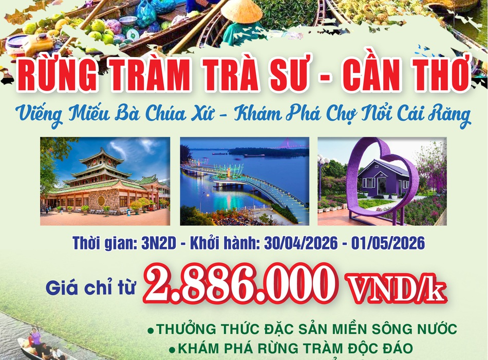 Bạn muốn “đổi gió” dịp lễ với không gian xanh mát, yên bình? Hành trình khám phá miền Tây sẽ đưa bạn đến những điểm đến nổi tiếng như Châu Đốc, Rừng tràm Trà SưCần Thơ!