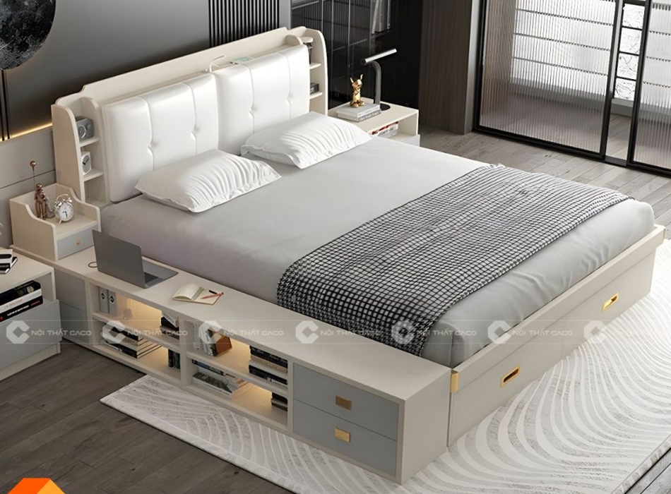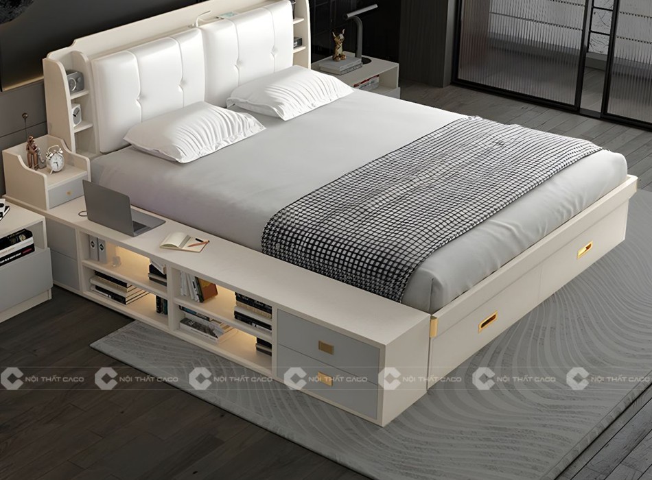 Mẫu giường ngủ gỗ công nghiệp thiết kế dạng hộp thông minh có kệ trang trí tạo ra một không gian nội thất phòng ngủ hiện đại và tiện nghi. Liên hệ Nội Thất CaCo để được tư vấn và báo giá nhanh nhất!