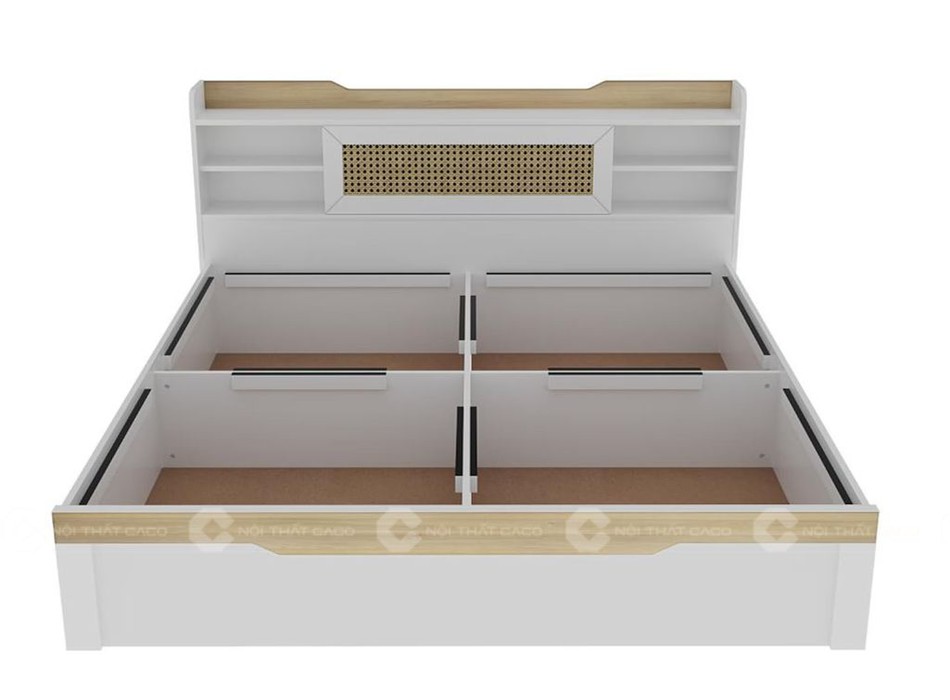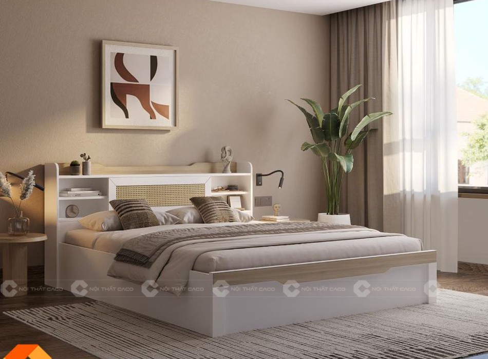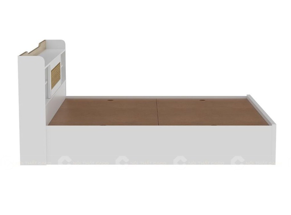 Giường ngủ gỗ công nghiệp được chế tác từ MDF phủ Melamine trắng, bền đẹp, hạn chế cong vênh và chống trầy xước hiệu quả. Bề mặt mịn, dễ lau chùi, giữ cho giường luôn mới. Phần đầu giường được bố trí nhiều ngăn kệ mở tiện dụng để đặt đồ decor, trong khi hộc đan mây tạo điểm nhấn cuốn hút.