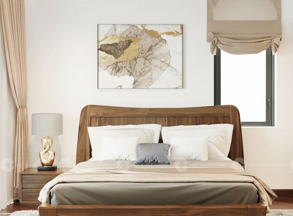 giường ngủ gỗ tự nhiên này nằm ở phần đầu giường cong mềm mại, mang lại cảm giác thanh thoát và nhẹ nhàng. Chính chi tiết uyển chuyển này giúp chiếc giường trở thành tâm điểm của không gian, tôn lên nét hiện đại và thư thái cho phòng ngủ.