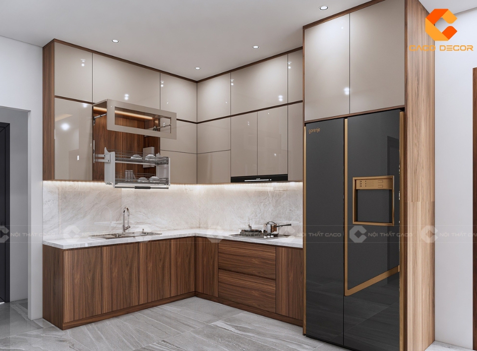 Hệ tủ bếp trên được làm kịch trần, tăng tối đa diện tích lưu trữ và hạn chế bụi bám. Bên trong trang bị giá nâng hạ thông minh, giúp thao tác cất lấy chén dĩa dễ dàng hơn. Màu kem bóng gương có khả năng bắt sáng, giúp không gian nội thất bếp sáng rộng, trong khi phần tủ dưới màu nâu gỗ tạo cảm giác ấm cúng và sang trọng.