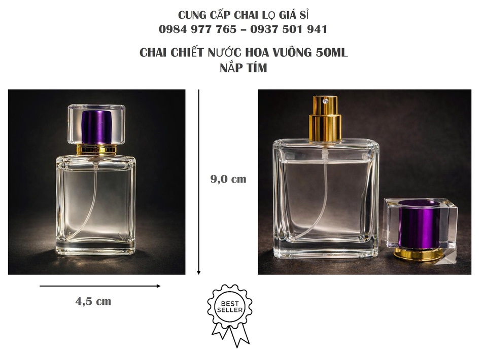10/03/26 Sỉ chai thủy tinh chiết nước hoa vuông 50ml - Nắp tím