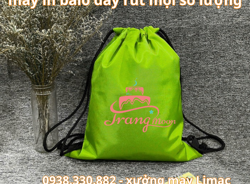 XƯỞNG MAY BALO DÂY RÚT XANH LÁ – IN LOGO BÁNH MÌ SHIP THEO YÊU CẦU
