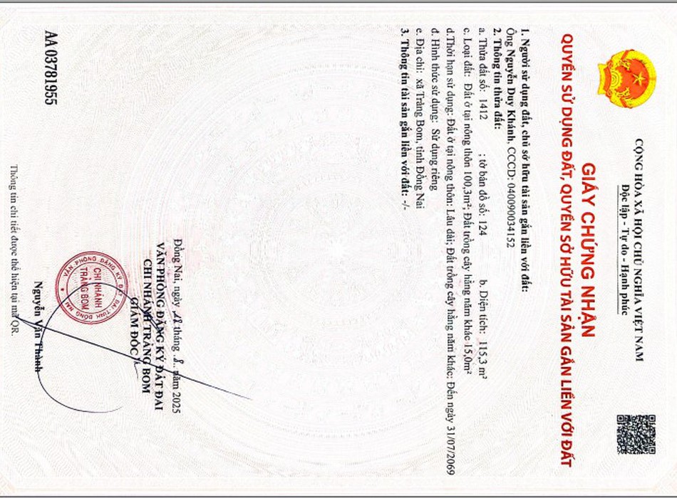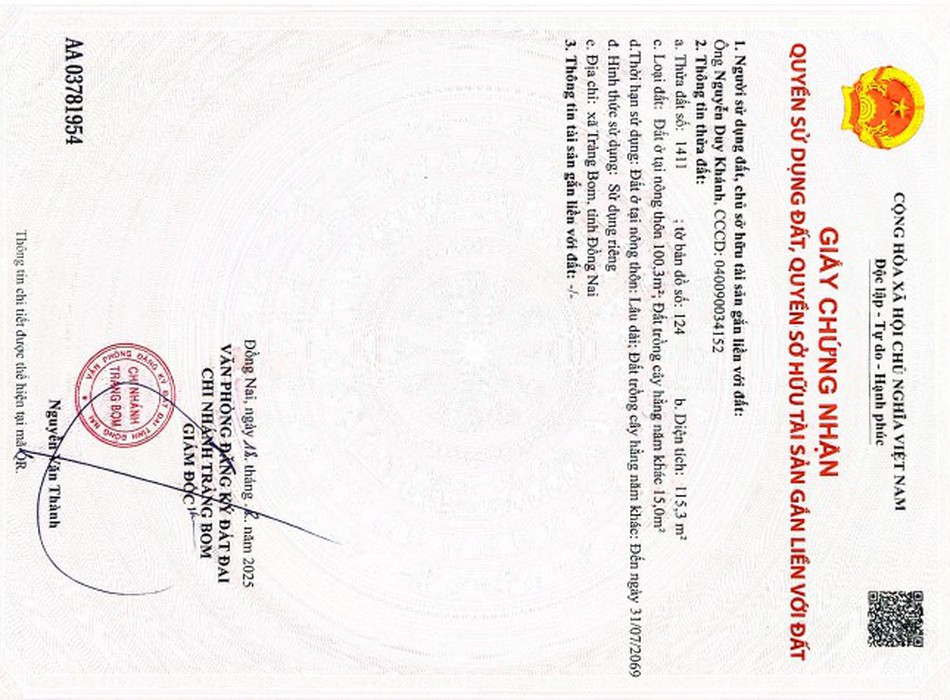 Đất thổ cư 100m2 - gần trung tâm trảng bom - giá chỉ 950 triệu