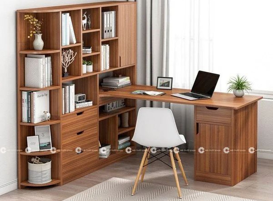 Bàn Làm Việc Tại Nhà Gỗ MDF Màu Nâu Kết Hợp Kệ Sách