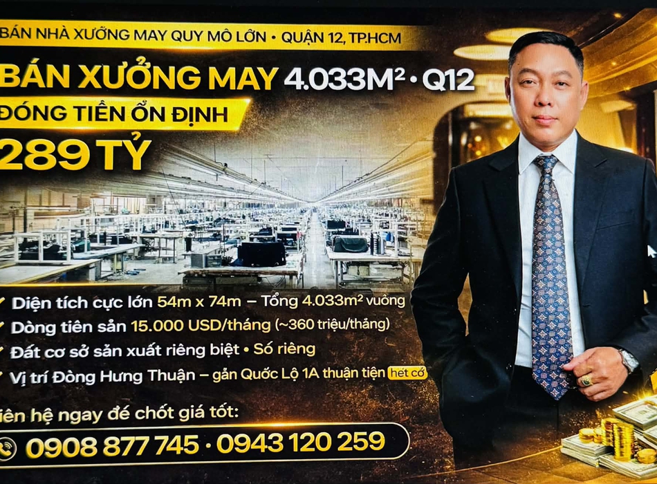 Xưởng may đông hưng thuận q12 gần ql1a - 4033m2 dòng tiền 360tr/th chỉ 289 tỷ