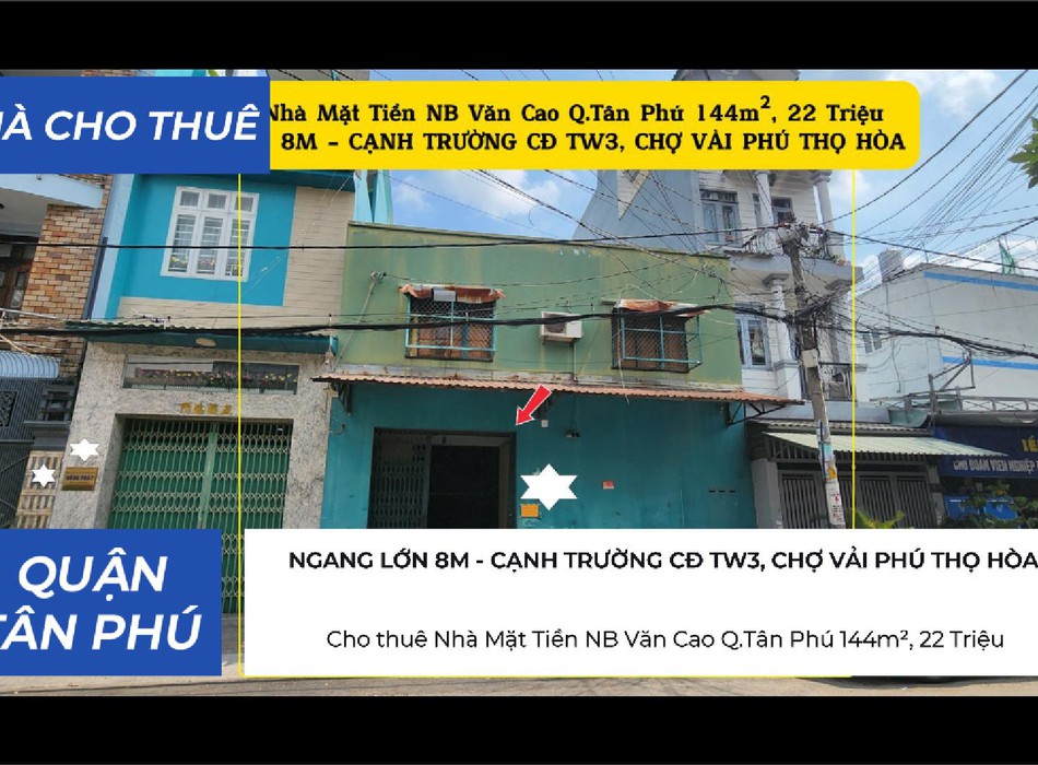 Cho thuê nhà mặt tiền nb văn cao q.tân phú 144m , ngang 8m, 22triệu - cạnh trường cđ tw3...